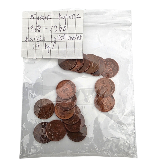 5 penniä kaikki lyöntivuodet 1918-40, 17kpl