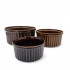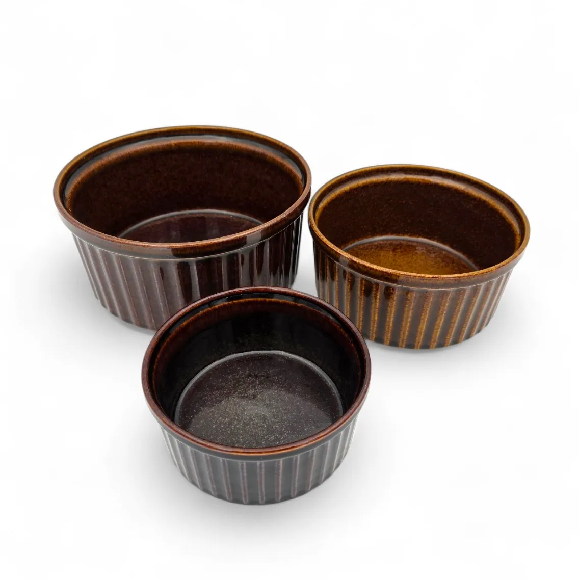 Kolme kokoa; suurin Korkeus 10 cm halkaisija 21 cm, keskikoko korkeus 8,5 cm halkaisija 17,5 cm ja pienin korkeus 7 cm halkaisija 14 cm