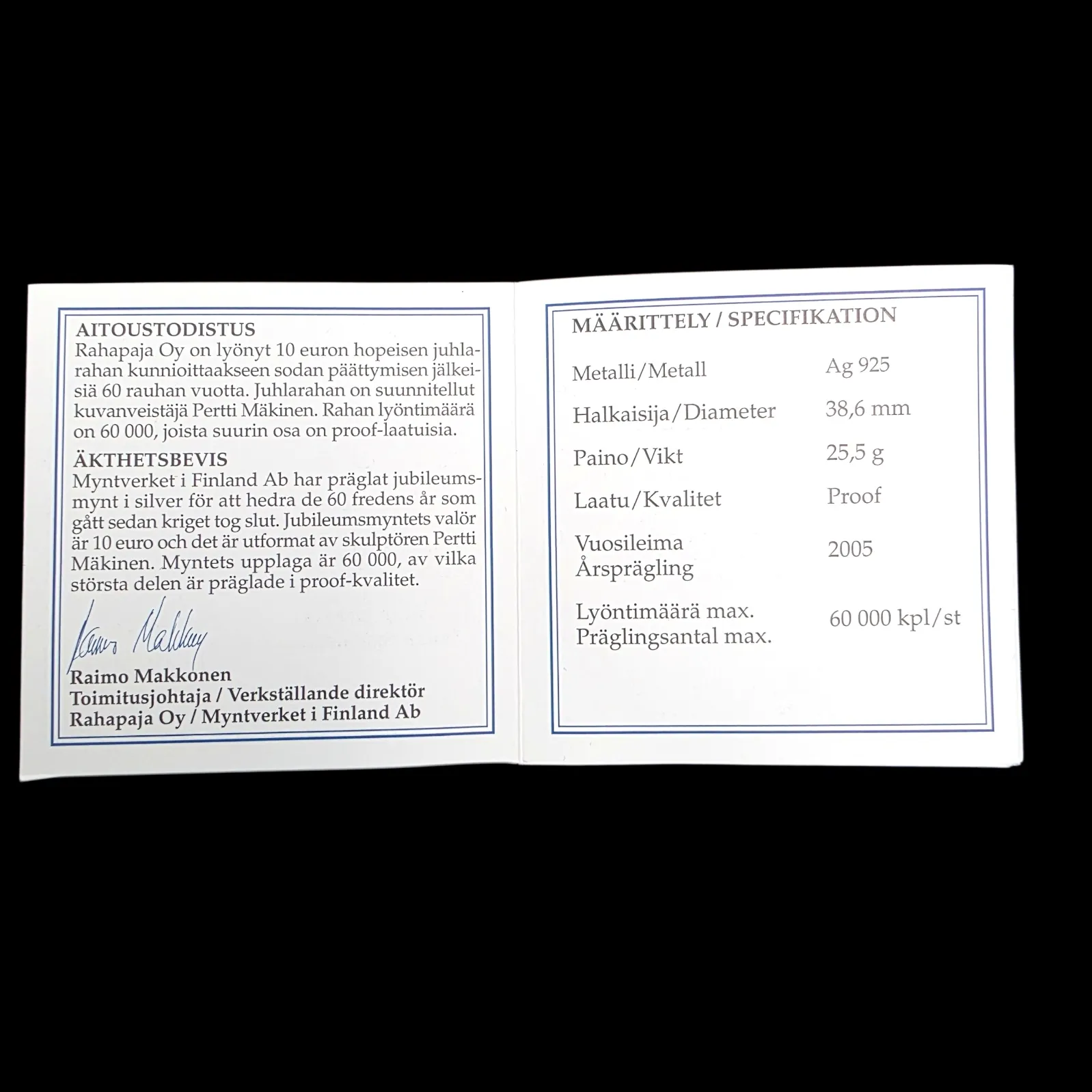 60 rauhan vuotta -juhlaraha 10€