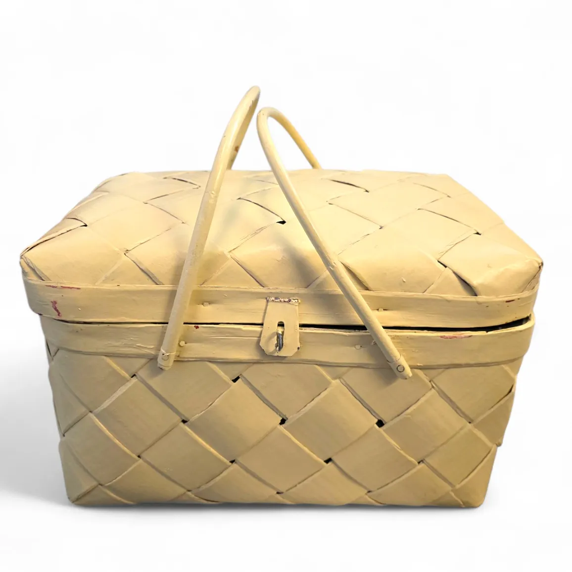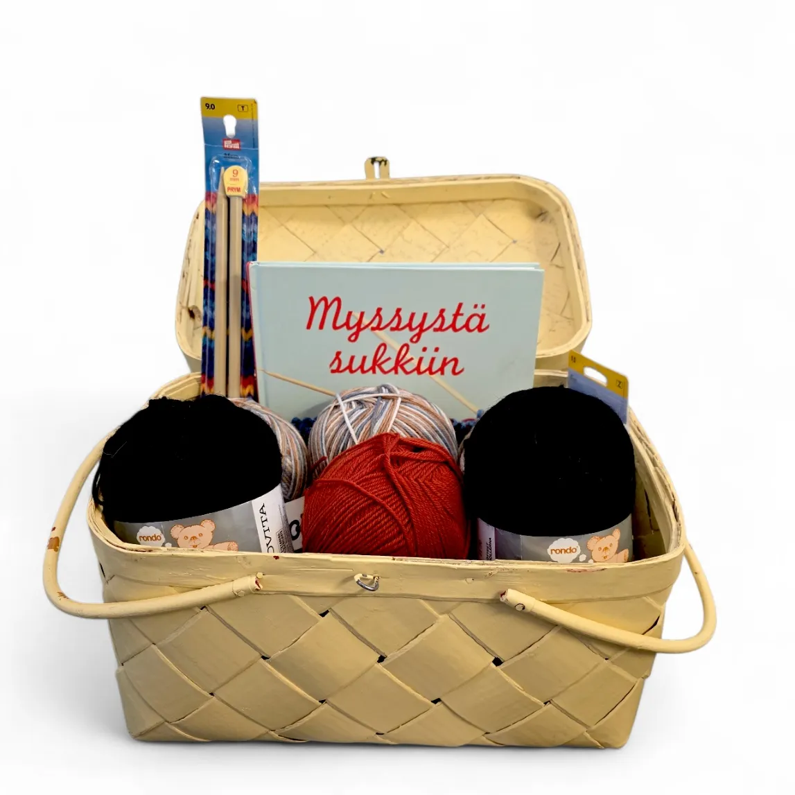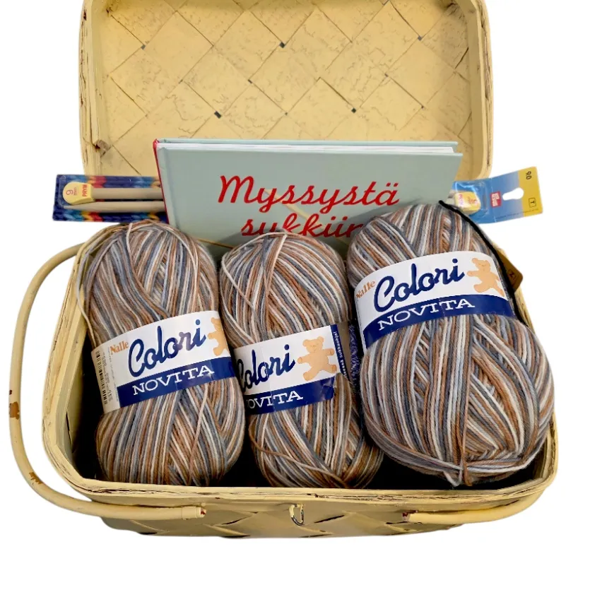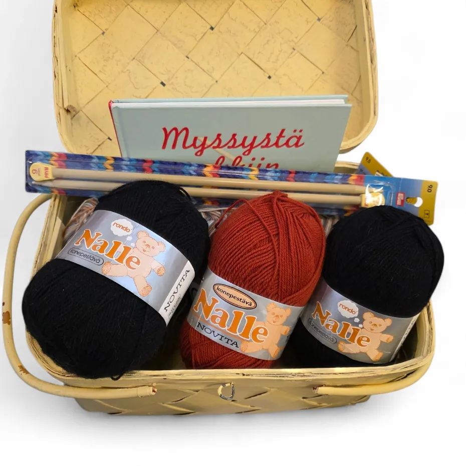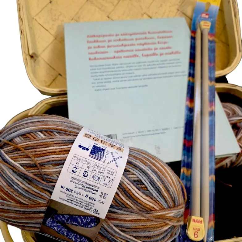 Kannellinen kori, lankoja, kirja, puikot