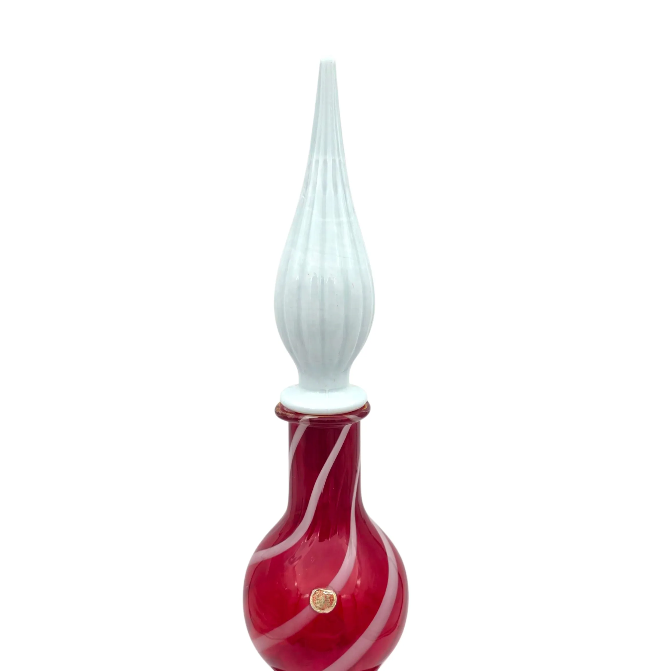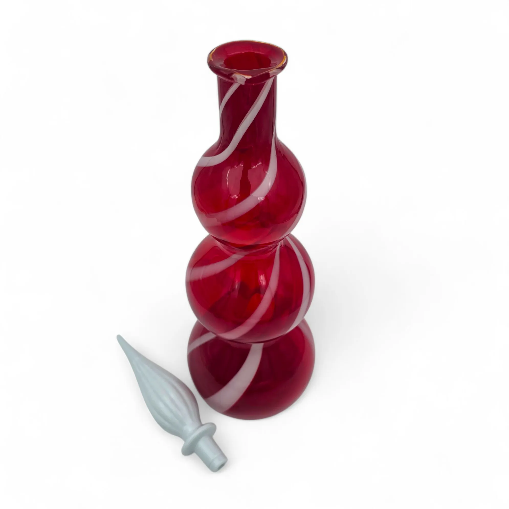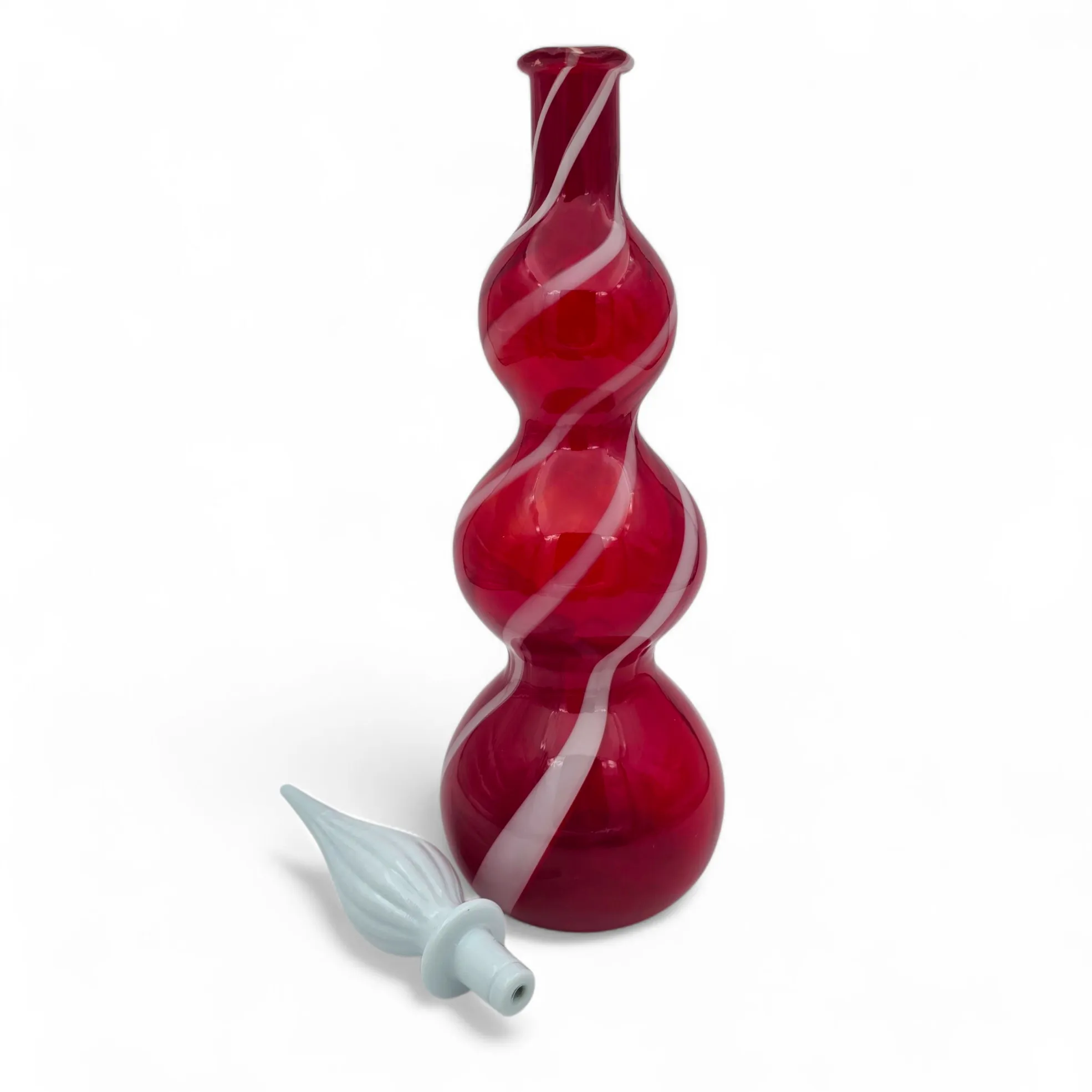 Rubiininpunainen valkoisella kierteellä, luunvalkoinen lasi korkki.