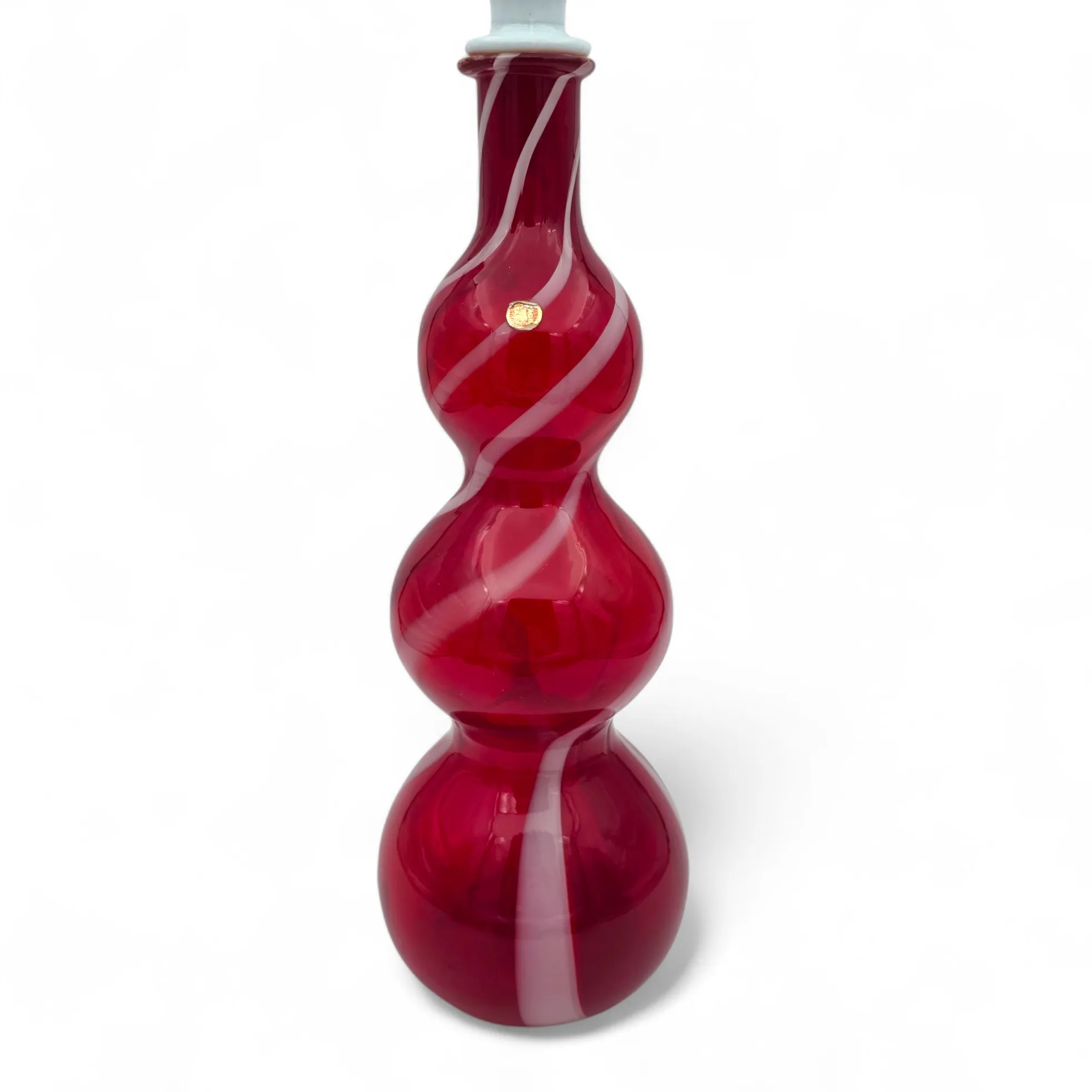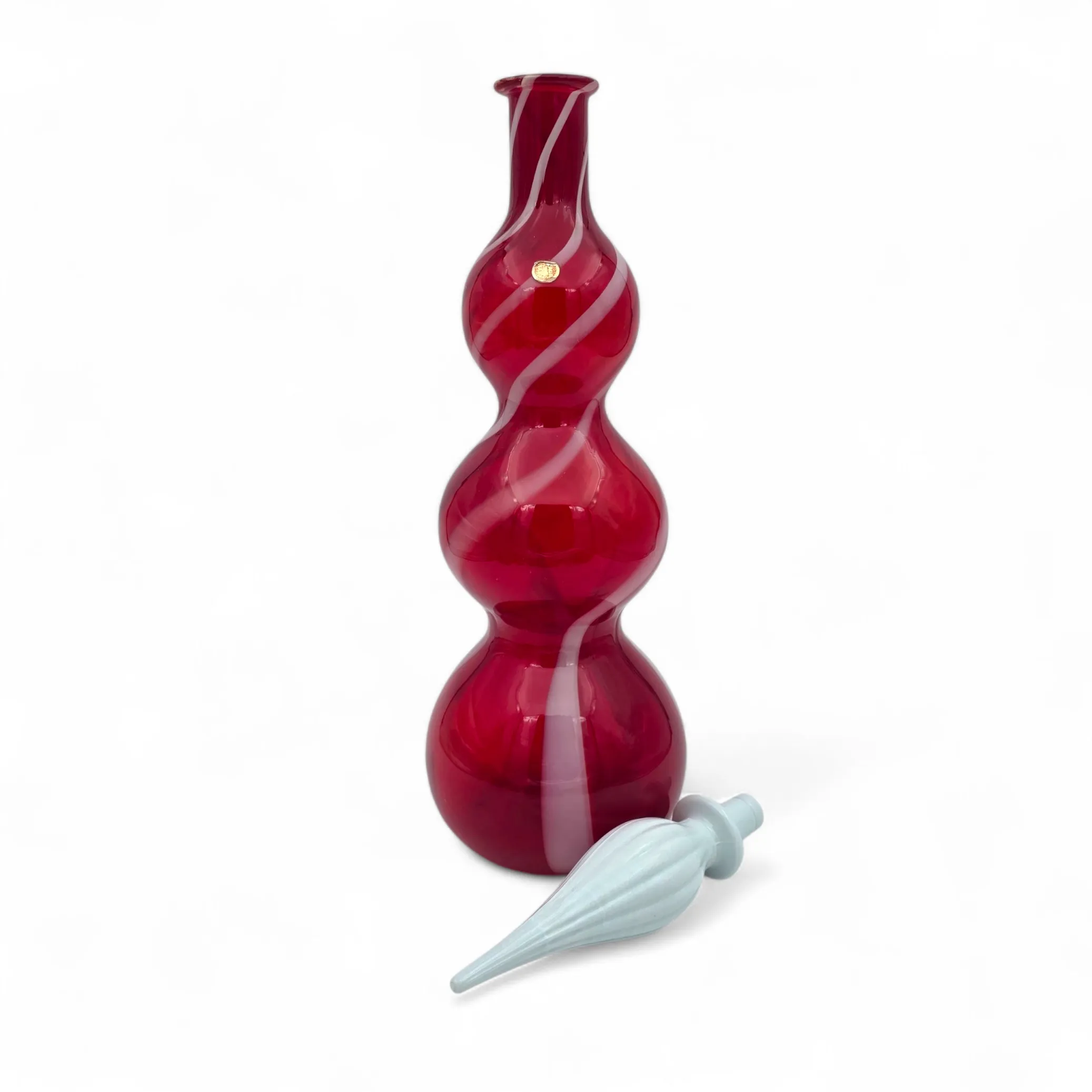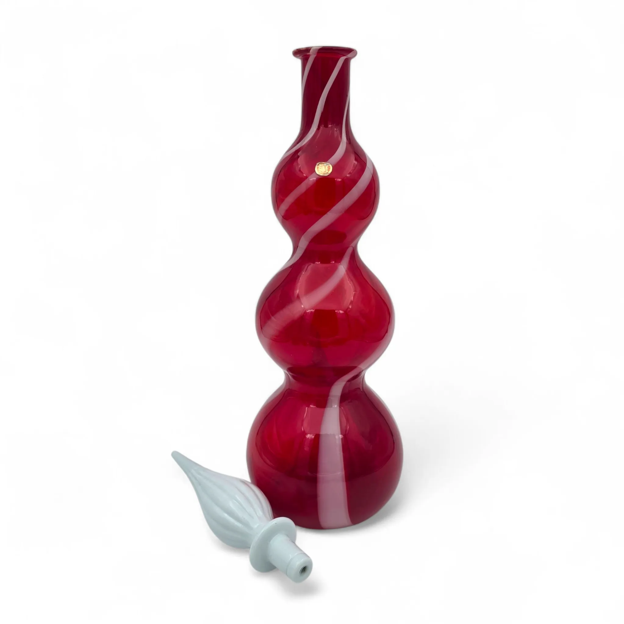 Rubiininpunainen valkoisella kierteellä, luunvalkoinen lasi korkki.