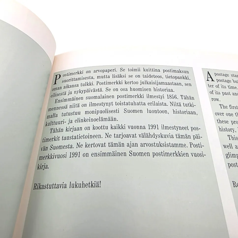 Kirja sisältää kaikki vuonna 1991 painetut postimerkit postituoreina, taustatietoineen.