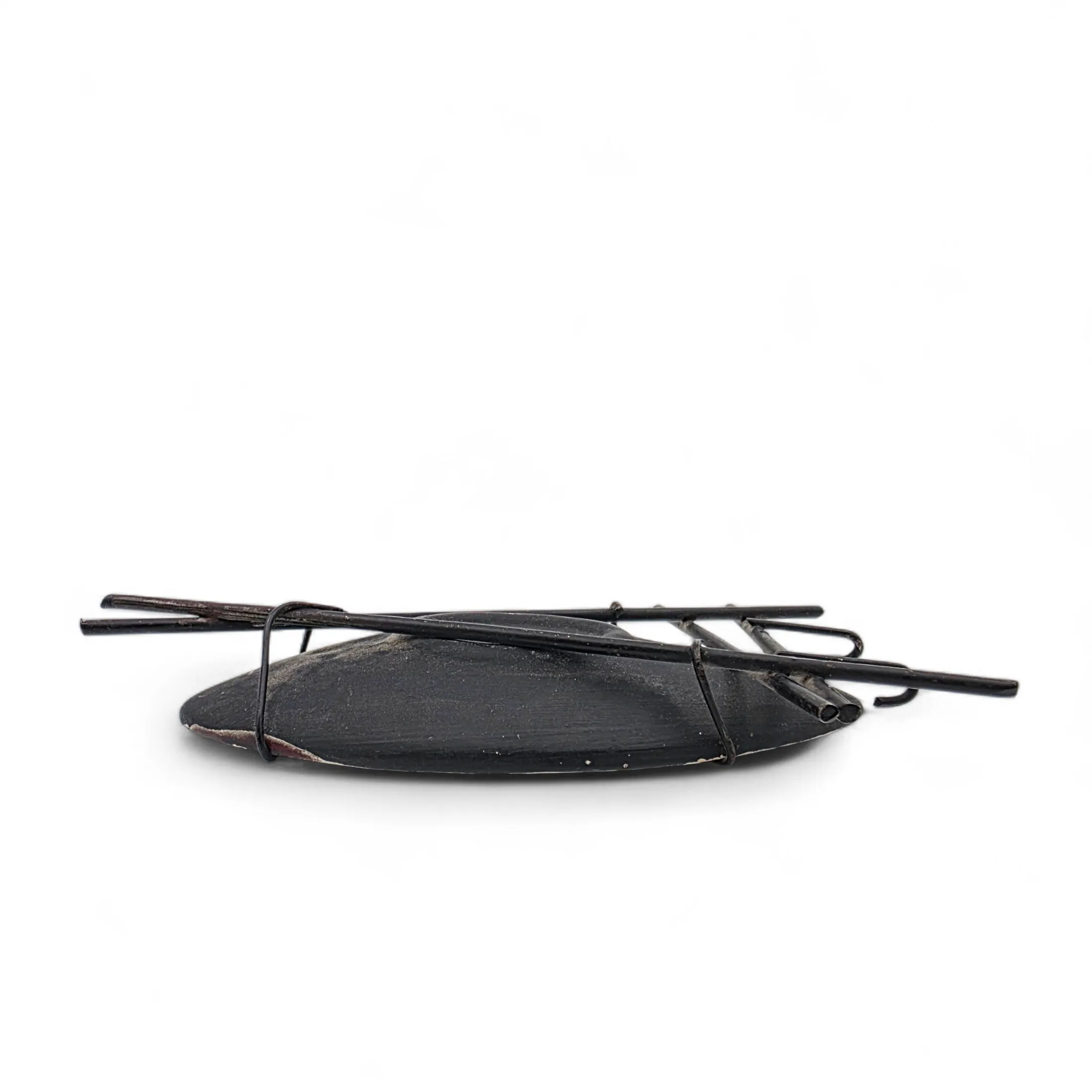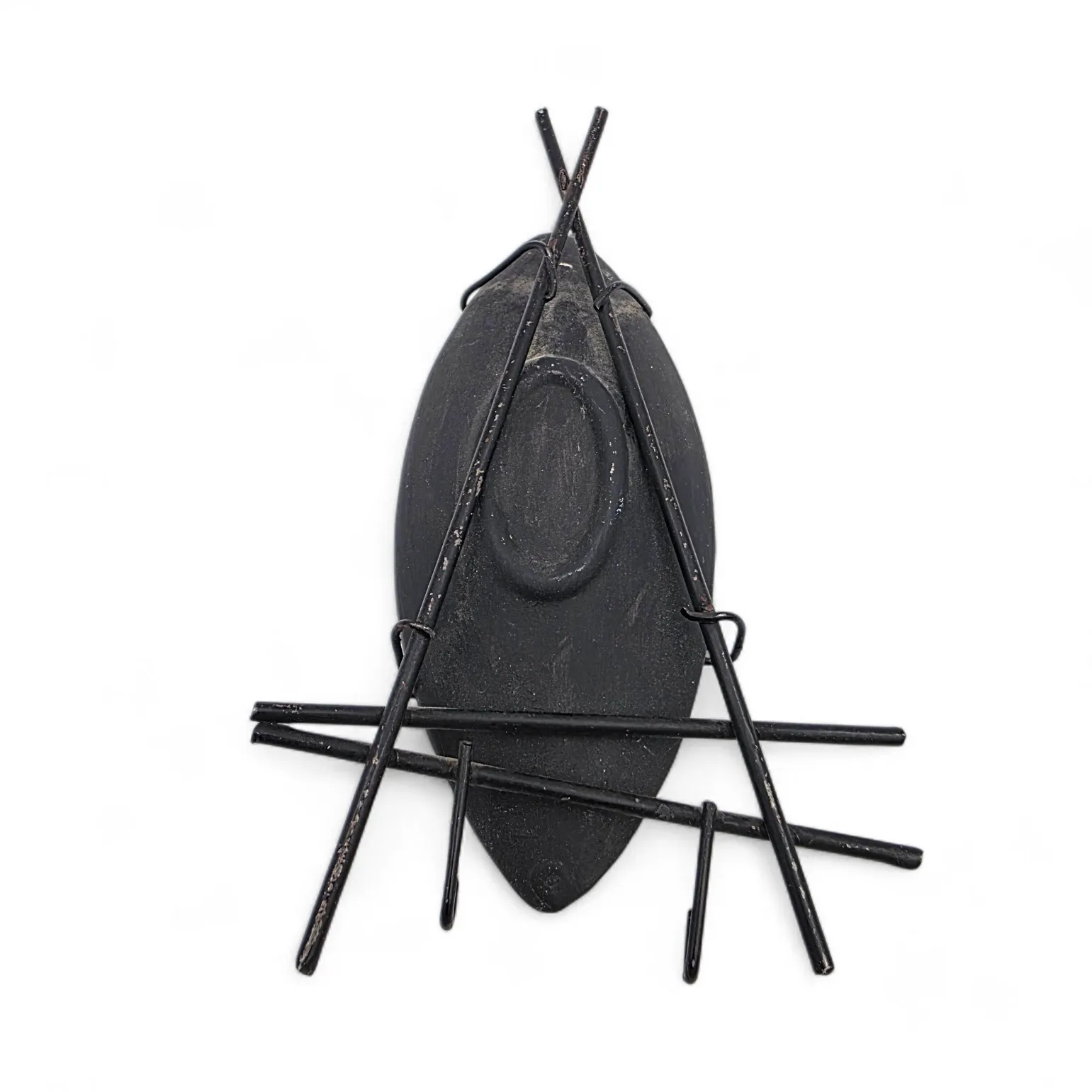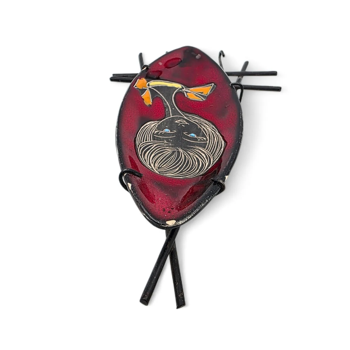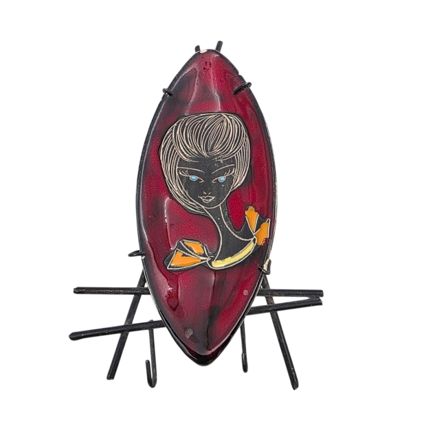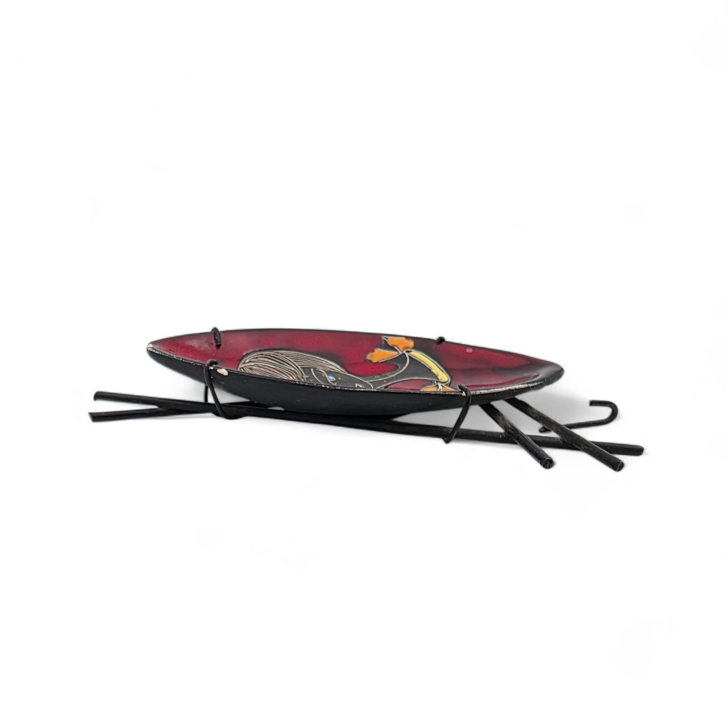 Lasitettu keramiikkalautanen metallikehys jossa kaki koukkua.